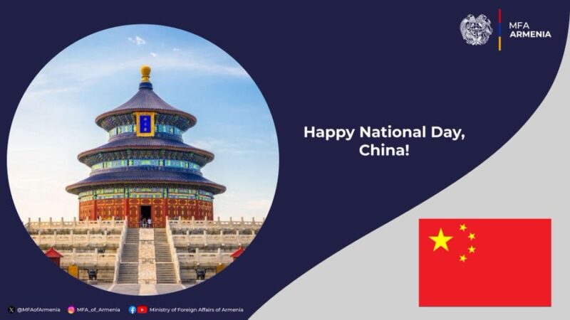 Հայաստանի ԱԳՆ-ն շնորհավորում է Չինաստանի Ժողովրդական Հանրապետության հիմնադրման 76-րդ տարեդարձի կապակցությամբ: