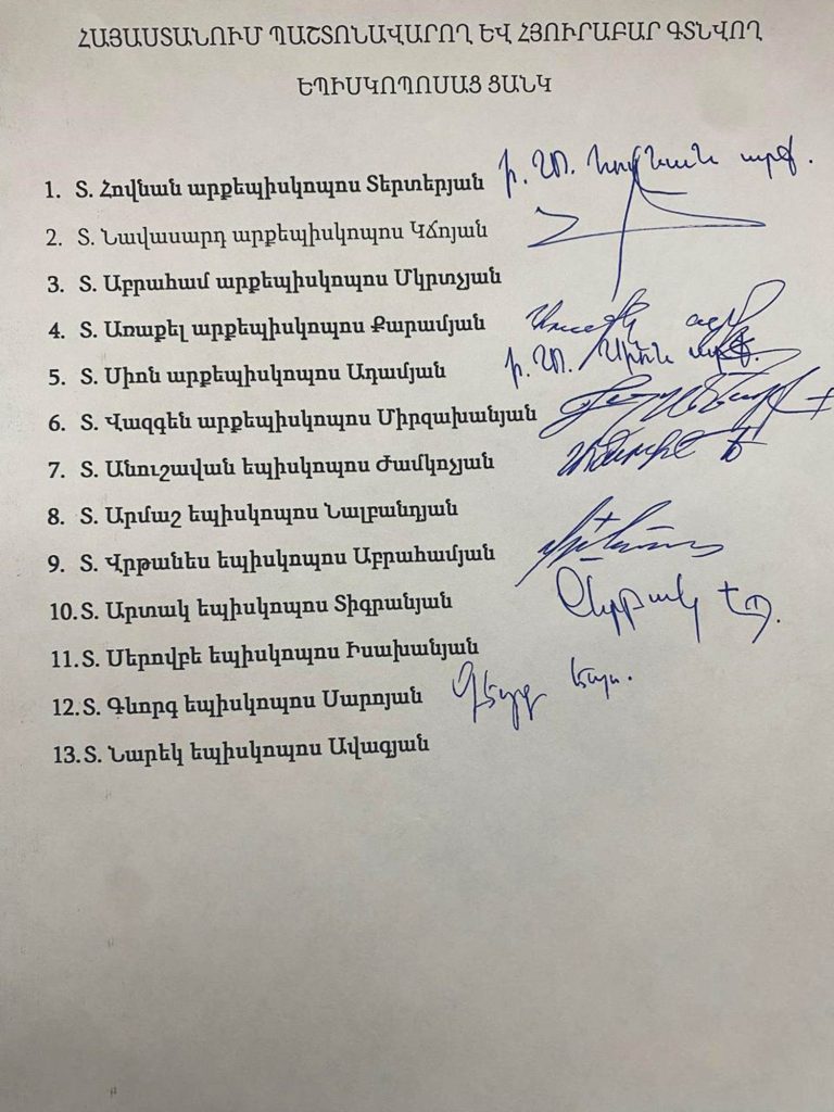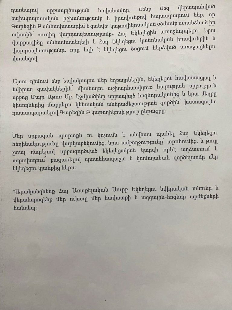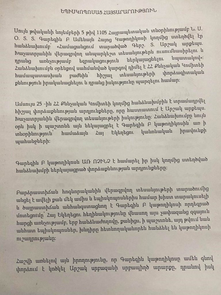 Հիշեցնենք, որ վարչապետի ընտանիքին պատկանող լրատվամիջոցը՝ «Հայկական ժամանակ»-ը գրել է, որ «տելեգրամյան ալիքներում Եպիսկոպոսաց դասին վերաբերող նոր հայտարարության լուսանկար է տարածվում: Դրանում ասվում է, որ փորձագիտությամբ հաստատվել է Մայր Աթոռի դիվանապետ Արշակ Խաչատրյանին վերագրվող տեսանյութերի իսկությունը, որը ներկայացվել է Գարեգին Բ-ին: Վերջինս առոչինչ է համարում այս արդյունքները:․․․ Հաշվի առնելով սա՝ եպիսկոպոսները դիմել են մնացյալ եպիսկոպոսներին և հանրությանը՝ հայ եկեղեցին Կտրիճ Ներսիսյանից և Արշակ Խաչատրյանից մաքրելու գործընթացին միանալու համար»: