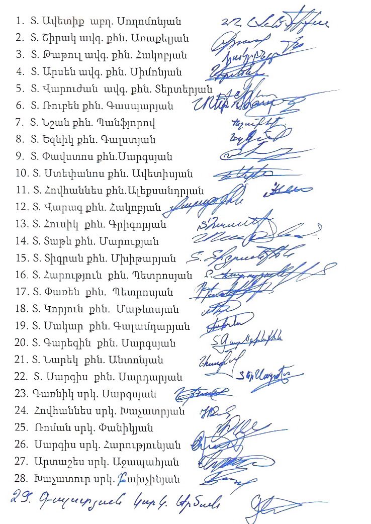 Մենք՝ ներքոստորագրյալներս՝ Շիրակի թեմի հոգևորականաց դասը, հայտարարում ենք, որ հիմա և միշտ, մեր կոչումին վայել, անշեղորեն կանոնական Սուրբ Պատարագ ենք մատուցելու և, մեր հավատարմությամբ առ Միածնաէջ Սուրբ Էջմիածին և նրա օրինավոր գահակալ՝ Ն.Ս.Օ.Տ.Տ. Գարեգին Բ Սրբազնագույն Կաթողիկոս, հիշատակելու ենք մեր Հայրապետի և թեմակալ առաջնորդ Բարձրաշնորհ Տ. Միքայել Արք. Աջապահյանի անունները: