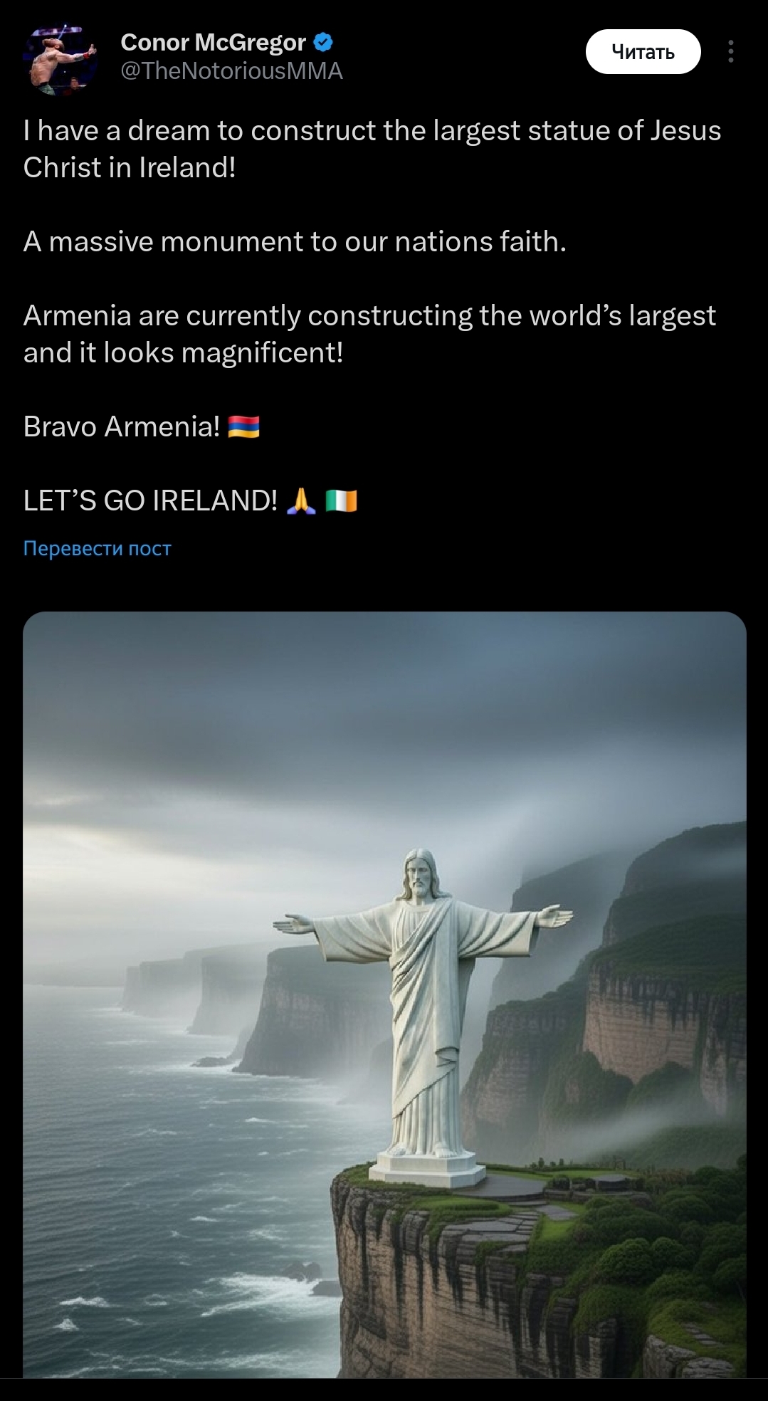 UFC-ի երկու քաշային կարգերում նախկին չեմպիոն Քոնոր Մակգրեգորը X-ի (նախկին Twitter) իր միկրոբլոգում անդրադարձել է Հայաստանում կառուցվող Հիսուս Քրիստոսի արձանին։