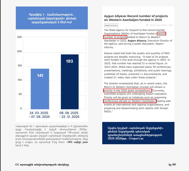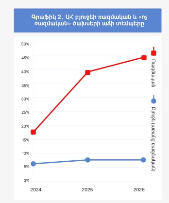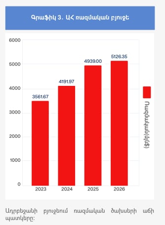 Ծառայությունը համեմատել է Ադրբեջանի բյուջեում ռազմական և այլ ոլորտների 2024-2026թթ․ հատկացումները 2023 թվականի նույն հատկացումների հետ։ Արդյունքում 2026 թվականի ռազմական հատկացումներն աճել են շուրջ 44%-ով, իսկ մյուս ոլորտային հատկացումները՝ ընդամենը 7.4%-ով։ 2026 թվականի դեպքում անգամ ոչ ռազմական ոլորտների հատկացումների որոշակի նվազում կա՝ 2025 թվականի հետ համեմատ, մինչդեռ ռազմական ոլորտի հատկացումները 2026 թվականի համար շարունակել են աճել։