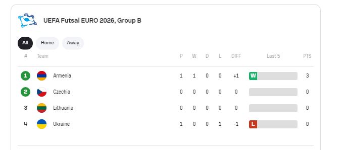 Ֆուտզալի ԵՎՐՈ-2026-ի B խմբի մրցաշարային աղյուսակը՝ ստորև․