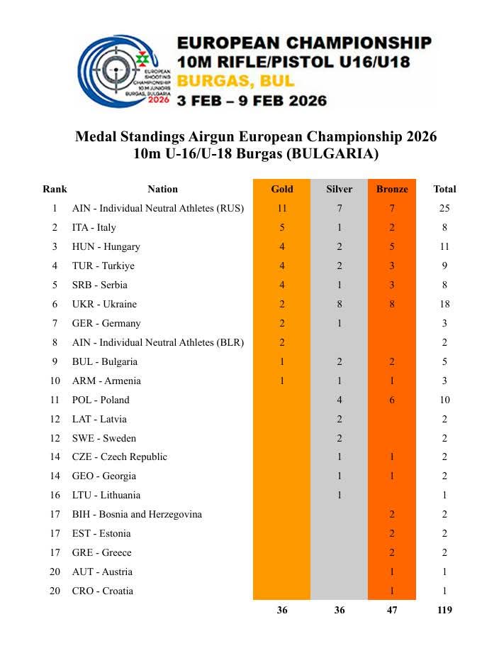 Բուլղարիայի Բուրգաս քաղաքում ավարտվել է մինչև 16 և 18 տարեկանների հրաձգության Եվրոպայի առաջնությունը։ Մրցումային վերջին օրը՝ 10 մ օդամղիչ ատրճանակ մրցաձևում, մինչև 18 տարեկան տղաների տրիոում Արմեն Գևորգյանը, Հայկ Սարգսյանը և Արտակ Ամիրյանը 880,2 միավոր արդյունքով նվաճել են բրոնզե մեդալ։