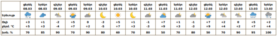 Մարտի 13-ին կեսօրից հետո սպասվում են տեղումներ. քաղաքի բարձրադիր հատվածներում ձնախառն անձրևի, ցածրադիր հատվածներում անձրևի տեսքով։ Մարտի 9-12-ը, 13-ի գիշերը սպասվում է առանց տեղումների եղանակ։