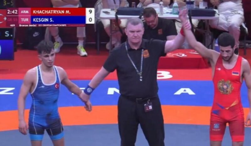 Եվրոպայի մինչև 23 տարեկանների առաջնությունում Հայաստանը ներկայացնող Մանվել Խաչատրյանը բրոնզե մեդալի համար գոտեմարտում ժամանակից շուտ հաղթել է թուրք Սերչան Կեշգինին ու կկանգնի պատվո հարթակի 3-րդ աստիճանին, հայտնում է Հայաստանի ըմբշամարտի ֆեդերացիան։