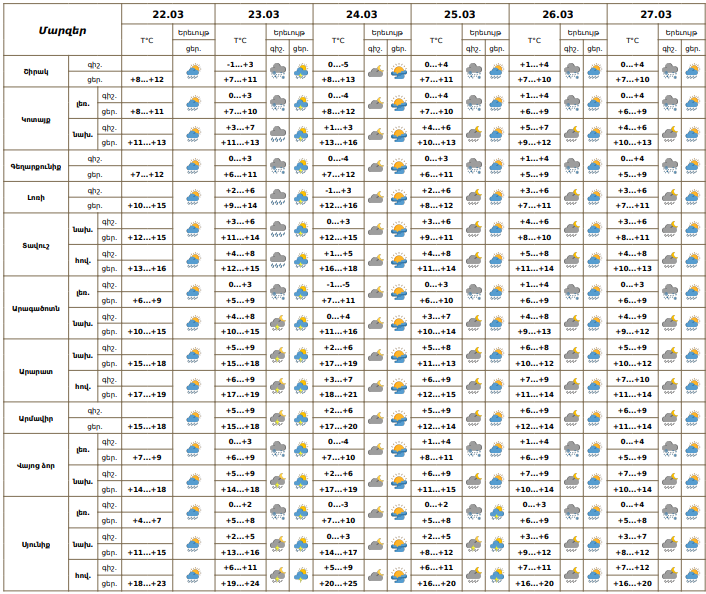 Մարտի 23-ին, 25-27-ին սպասվում է կարճատև անձրև, հնարավոր է նաև ամպրոպ։ Մարտի 24-ին սպասվում է առանց տեղումների եղանակ։