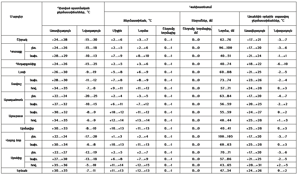 Միջին առավելագույն ջերմաստիճանը Շիրակում գրանցվում է` +17…+20°C, Լոռիում` +20…+24°C, Տավուշում` +20…+25°C, Գեղարքունքիում` +13…+17°C, Արարատյան դաշտում` +25…26°C, Սյունիքում` +23…+29°C: