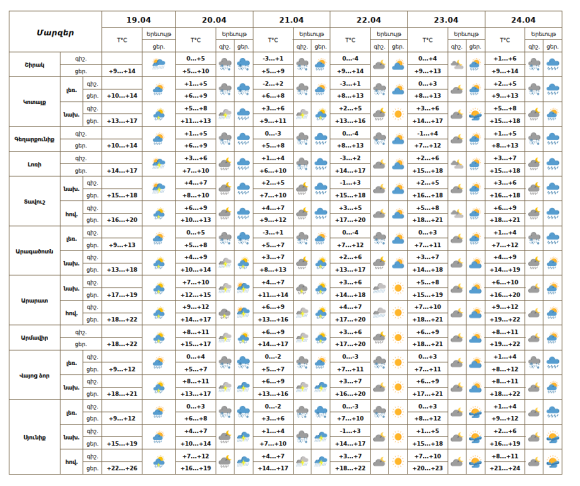 Օդի ջերմաստիճանն ապրիլի 20-ի ցերեկը կնվազի 4-6 աստիճանով, ապրիլի 22-24-ի ցերեկային ժամերին աստիճանաբար կբարձրանա 2-4 աստիճանով։