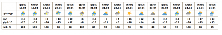 Ապրիլի 20-21-ը ժամանակ առ ժամանակ, 22-ի գիշերը, 23-ի կեսօրից հետո, 24-ին սպասվում է անձրև և ամպրոպ, ապրիլի 20-ին՝ ինտենսիվ։ Ամպրոպի ժամանակ՝ քամու ուժգնացում՝ 15-18 մ/վ արագությամբ։