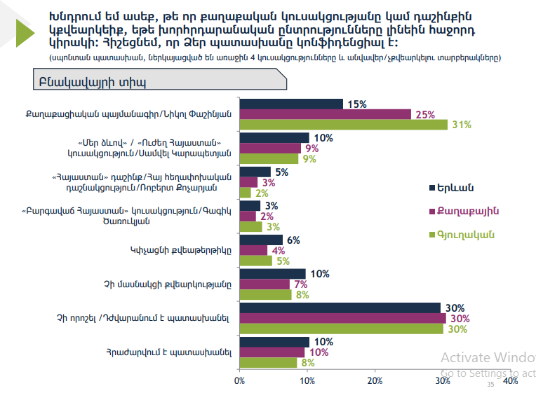 «Гражданский договор» / Никол Пашинян — сельская местность: 31%, городская местность: 25%, Ереван: 15%