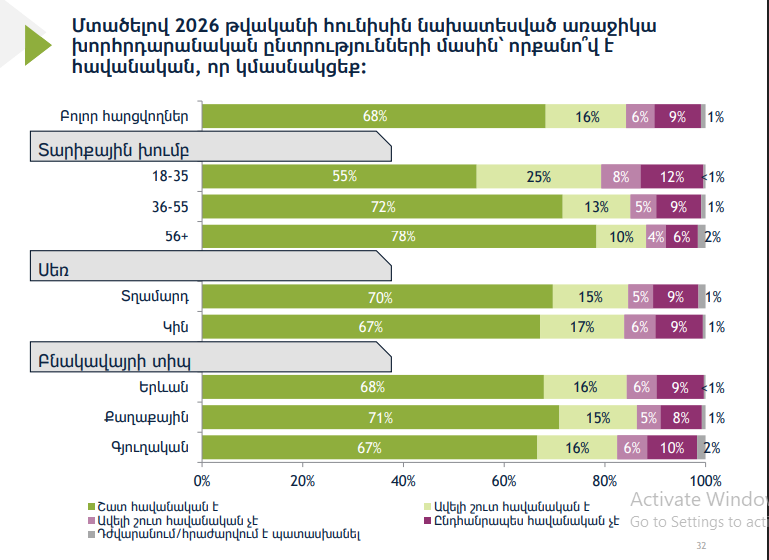 На вопрос «Насколько вероятно, что вы примете участие в предстоящих парламентских выборах, запланированных на июнь 2026 года?» 84% опрошенных ответили положительно, 15% — отрицательно, а 1% затруднился ответить или отказался от ответа.