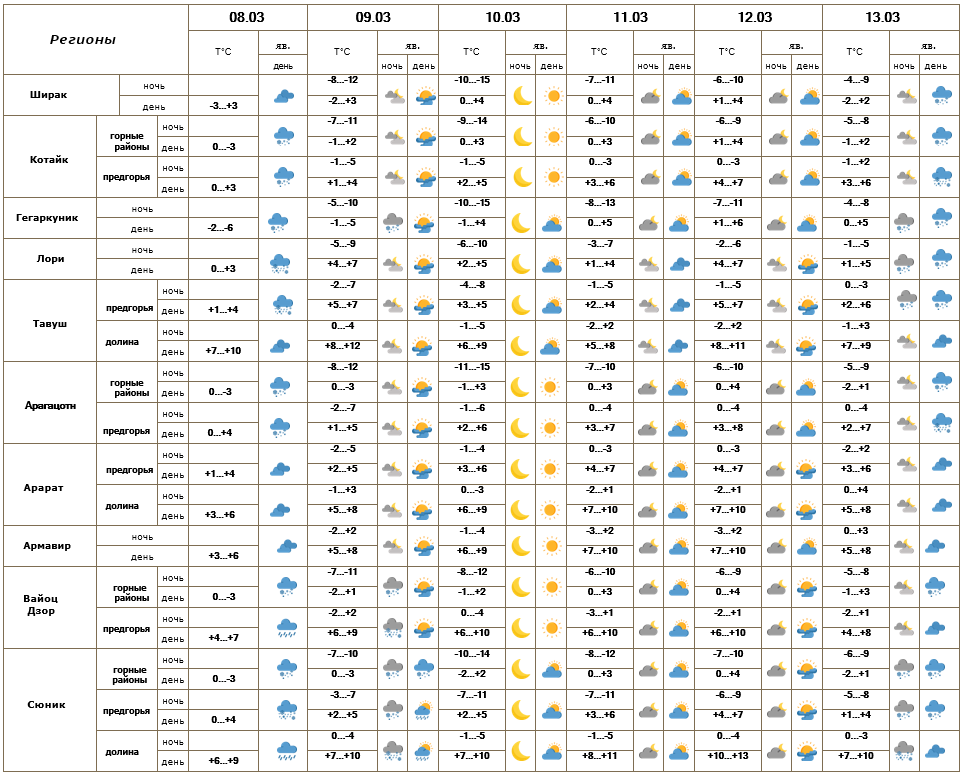 Днем 9-го марта, в отдельных районах 13-го в отдельных районах ожидаются осадки, в горных районах и предгорьях – в виде снега, в долинах — в виде дождя со снегом и дождя. В горных районах также ожидается метель, низкая горизонтальная видимость. С 10-12 марта ожидается погода без осадков.