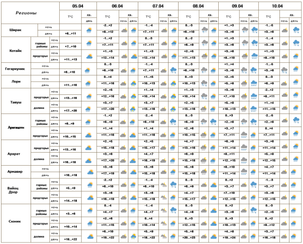6-ого апреля температура воздуха постепенно повысится на 2-4 градуса, в регеонах Лори и Тавуш – на 6-8 градусов.