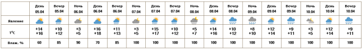 После полудня 6-го апреля возможен кратковременный дождь. С 7-10-го апреля время от времени ожидается дождь.