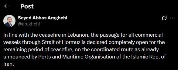 In line with the ceasefire in Lebanon, the passage for all commercial vessels through Strait of Hormuz is declared completely open for the remaining period of ceasefire, on the coordinated route as already announced by Ports and Maritime Organisation of the Islamic Rep. of Iran.